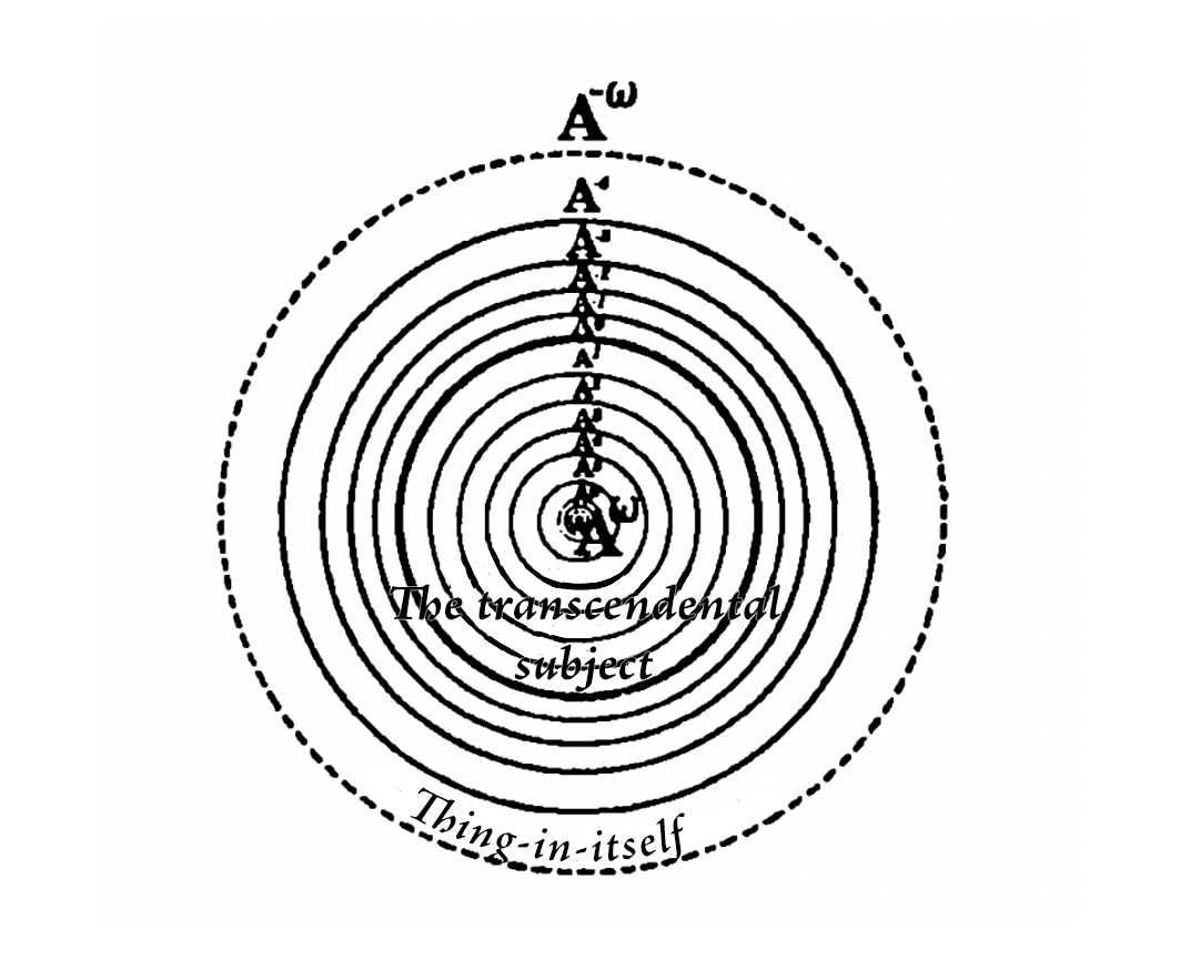 Let us draw a system, i.e., an infinite set, of concentric circles that, on the one hand, gravitate and accumulate around the centre, that is, infinitely approaching the centre that denotes the transcendental subject . On the other hand, these circles infinitely increase their radius and aim for the infinitely-large circle that denotes the thing in itself, . One of the circles, , serves he bound of I and not-I, or a thing. All other circles are denoted as , ordered according to the series (30). Let us then colour all these rings; for example, the outer rings shall be blue and the inner rings shall be pink. The depth of the colour of the area between the pairs of concentric circles will denote the relation to either the subjective or the objective side of the series (30), and the colour itself (red or blue) the dominance of either subjectivity or objectivity. The circles within the circle denote the realm of I, and the circles outside of denote the realm of not-I.